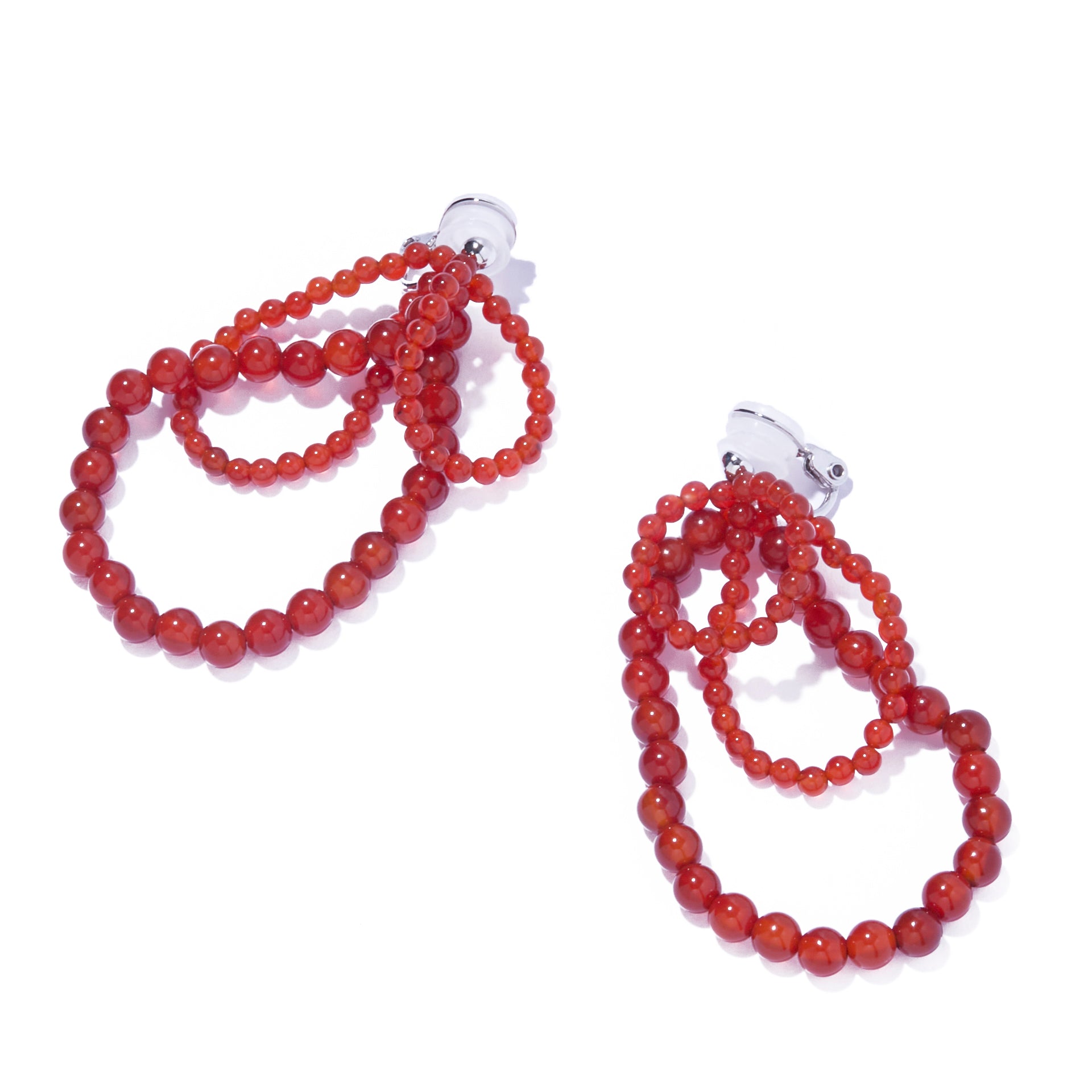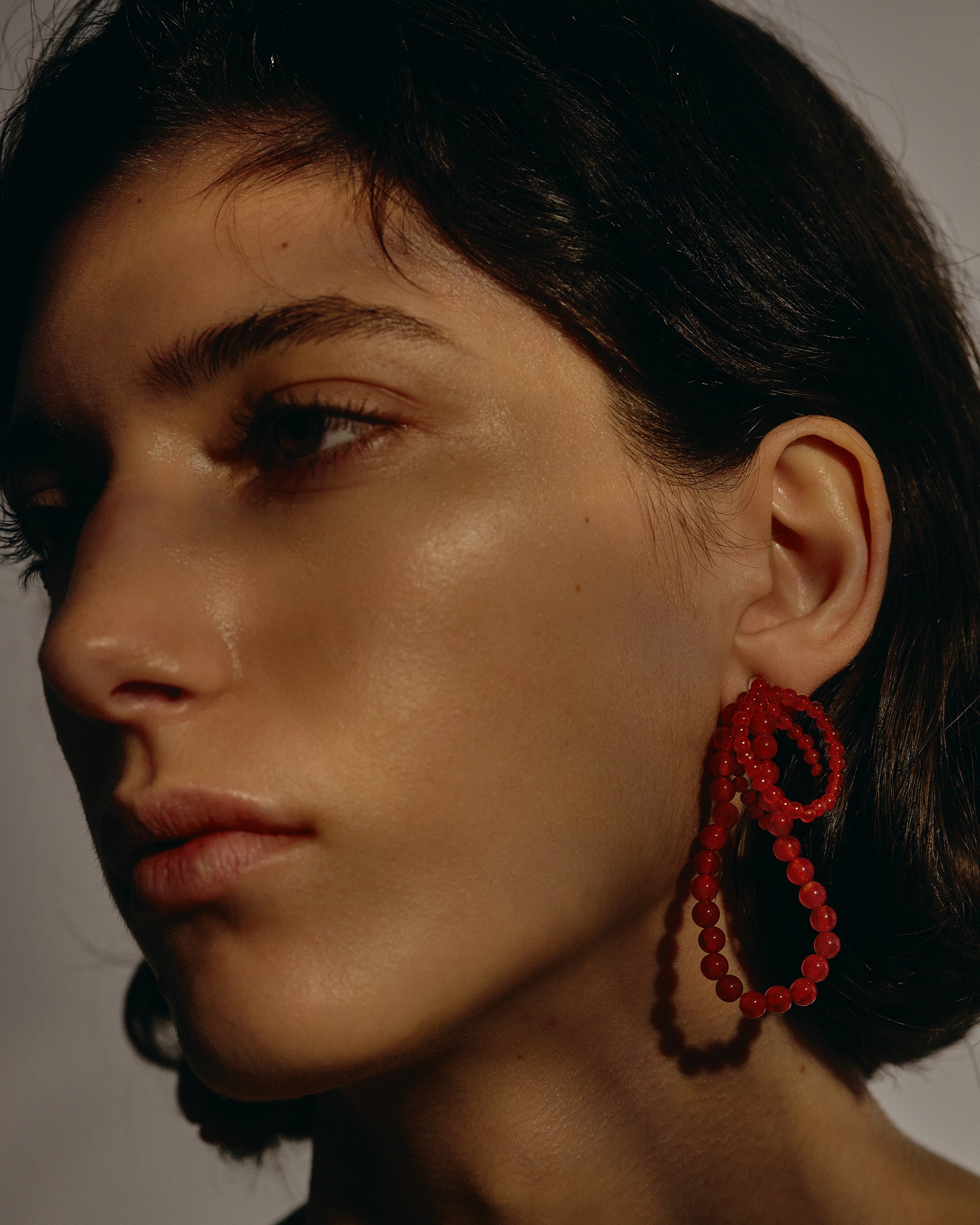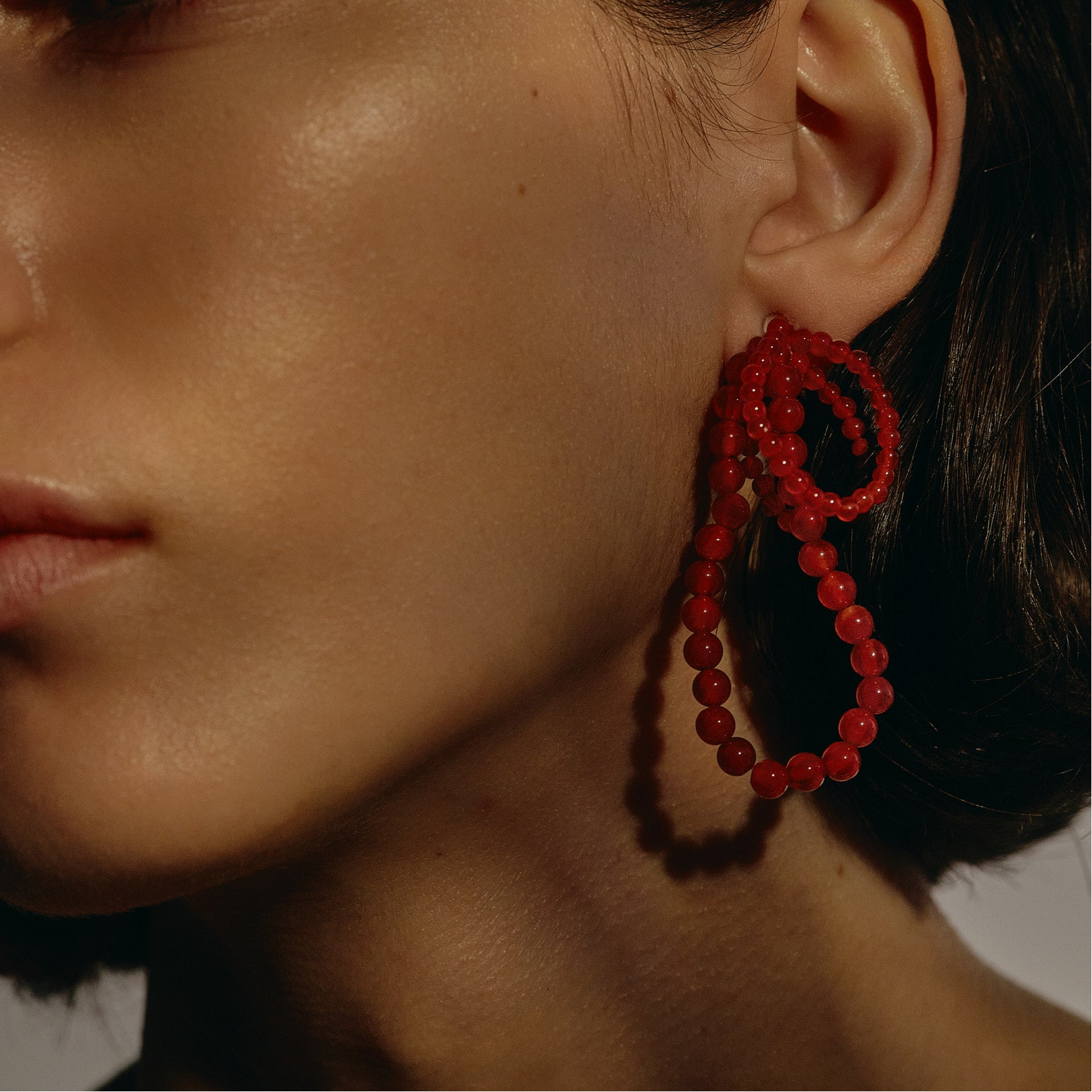 重層的な曲線と熱を帯びたように艶めく赤が合わさって、高揚感のある顔周りを演出します。