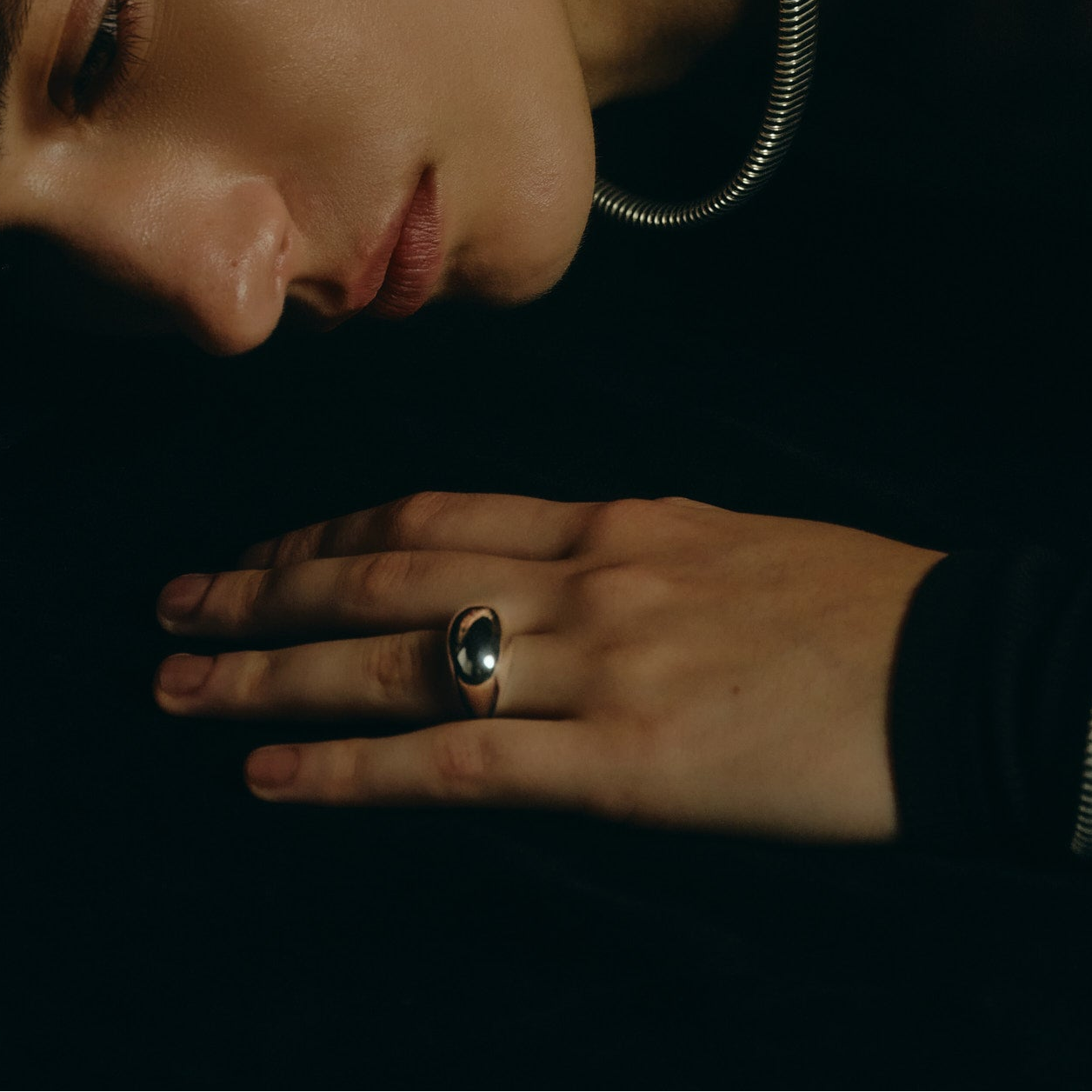 シルバーの静けさとモチーフの有機性が同居し、アーティな空気を纏わせるリング。