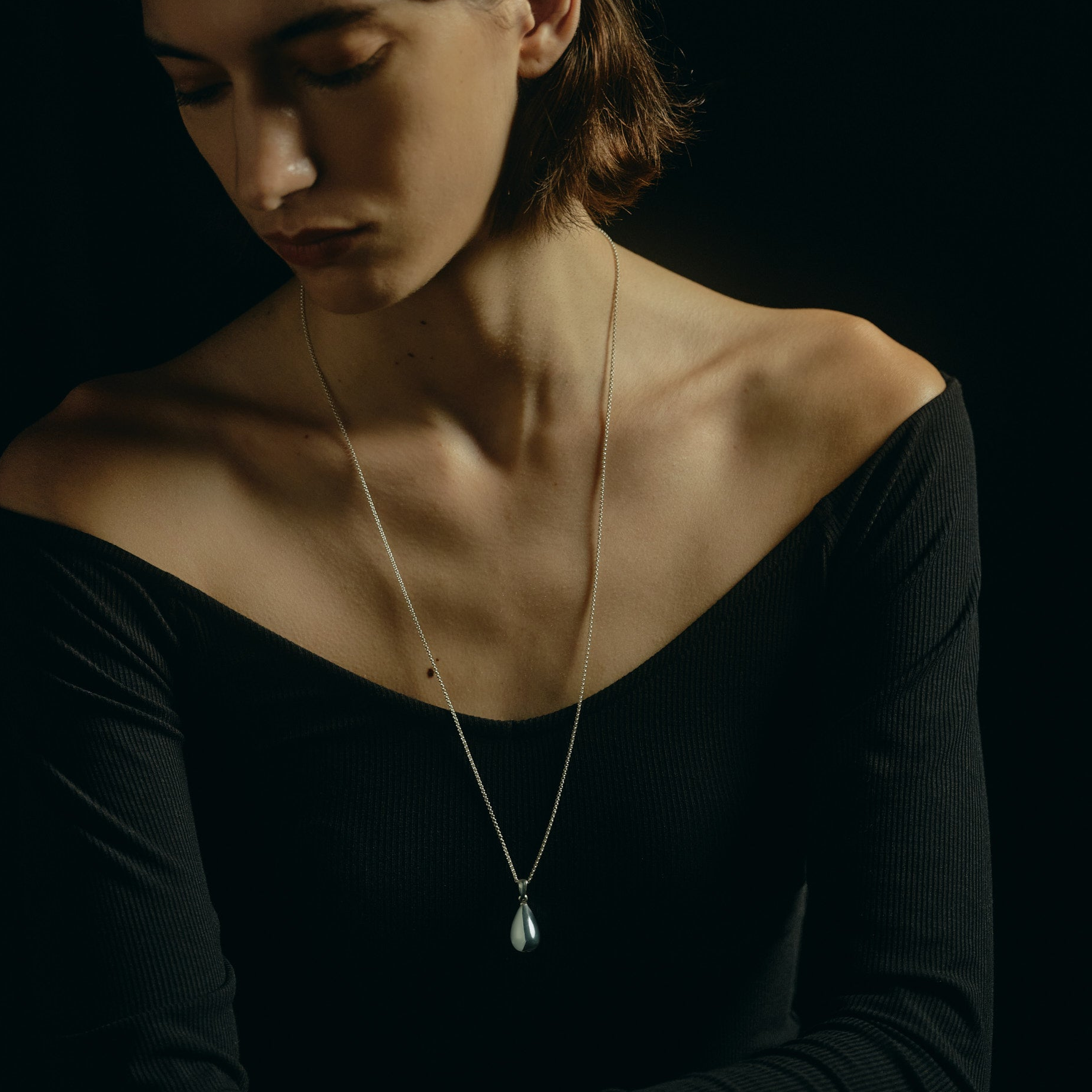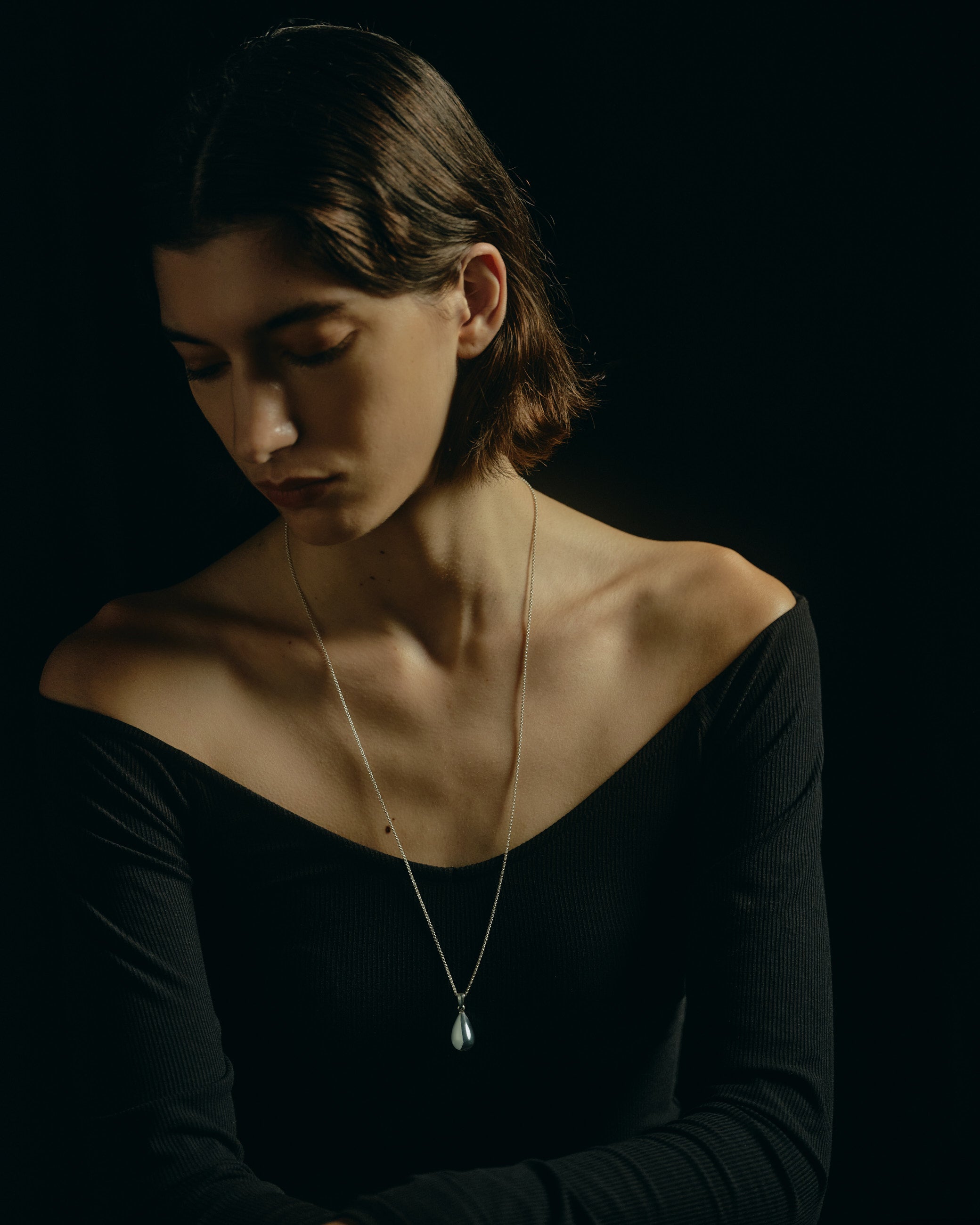 華奢なロングチェーンとの対比で、クワイエットモードな空気を際立たせます。