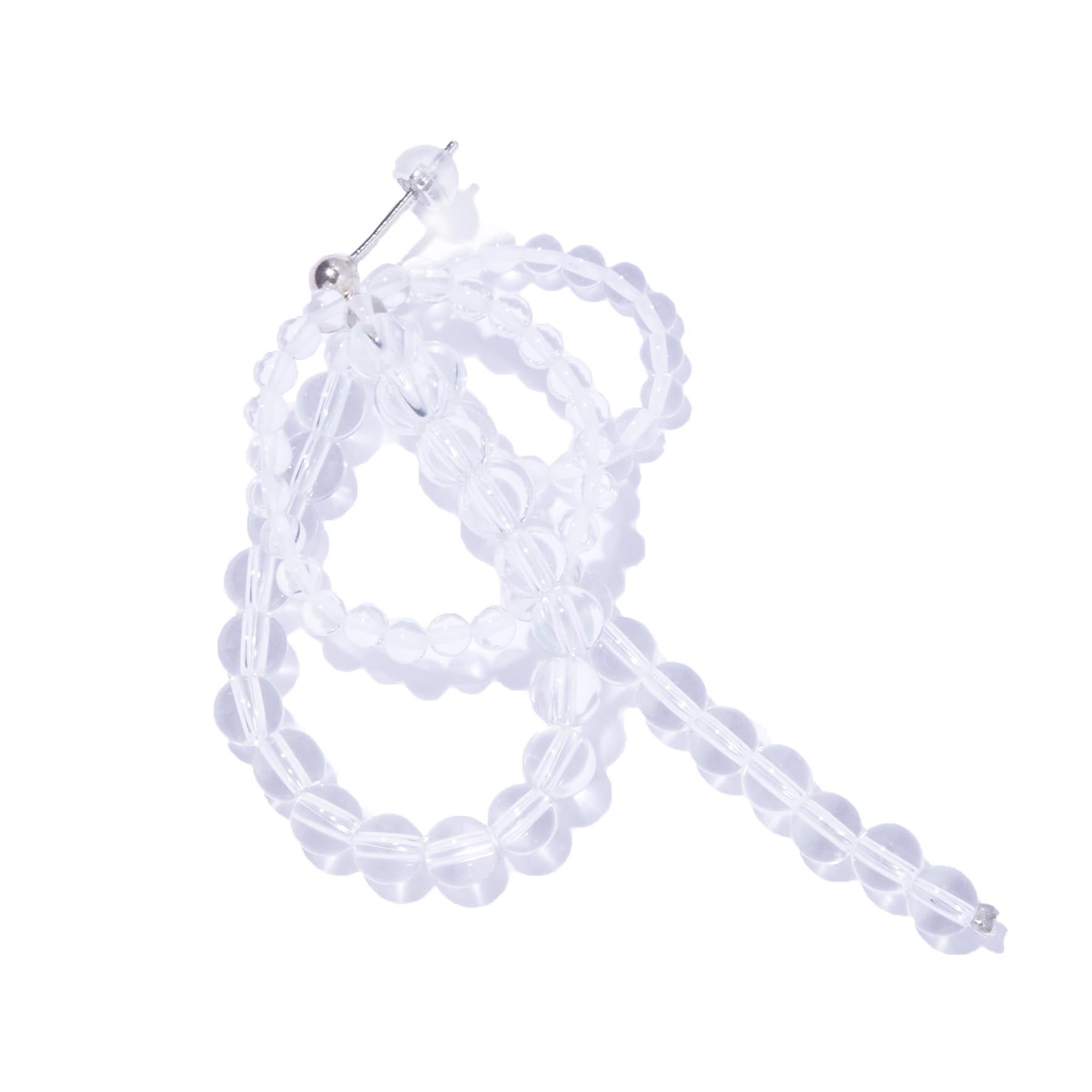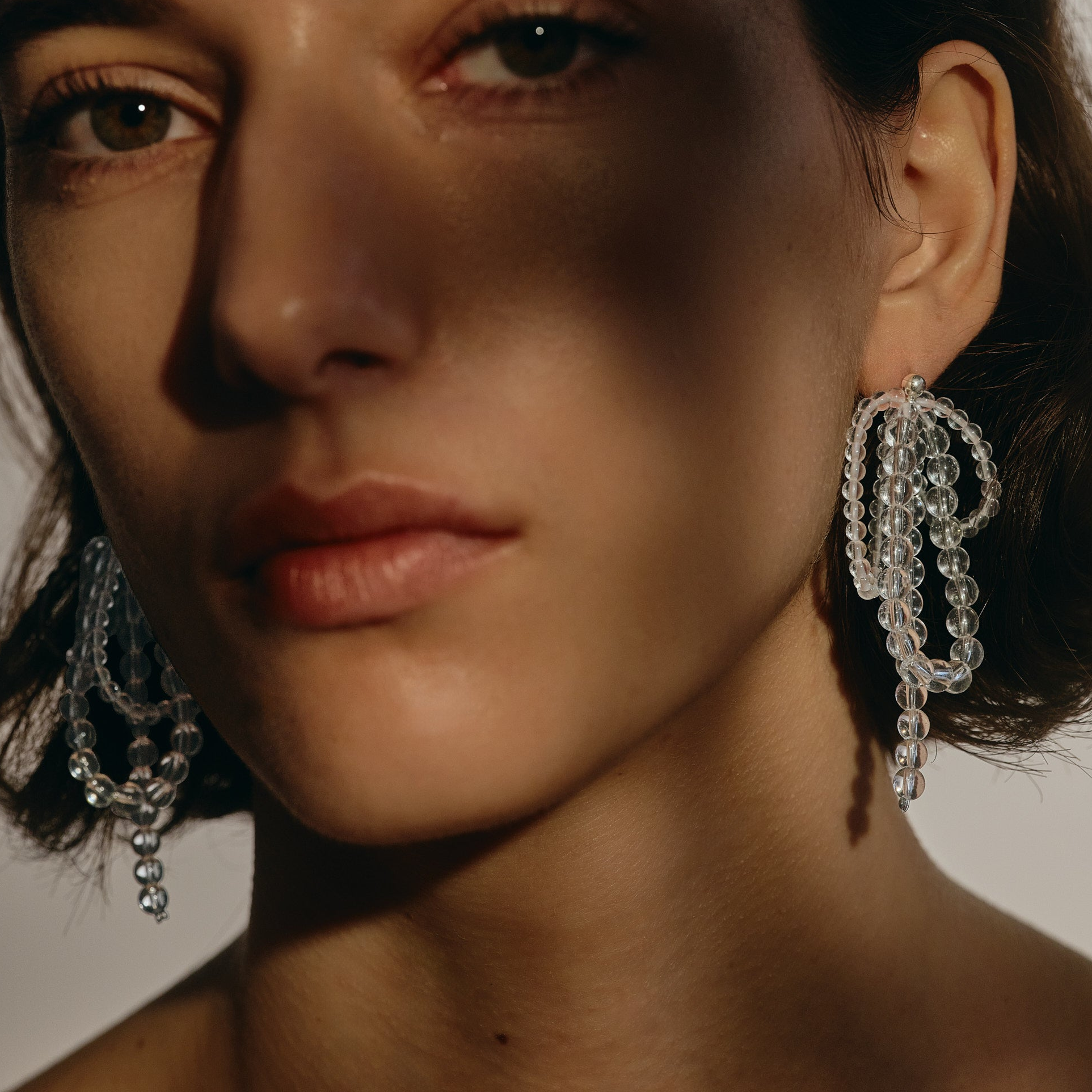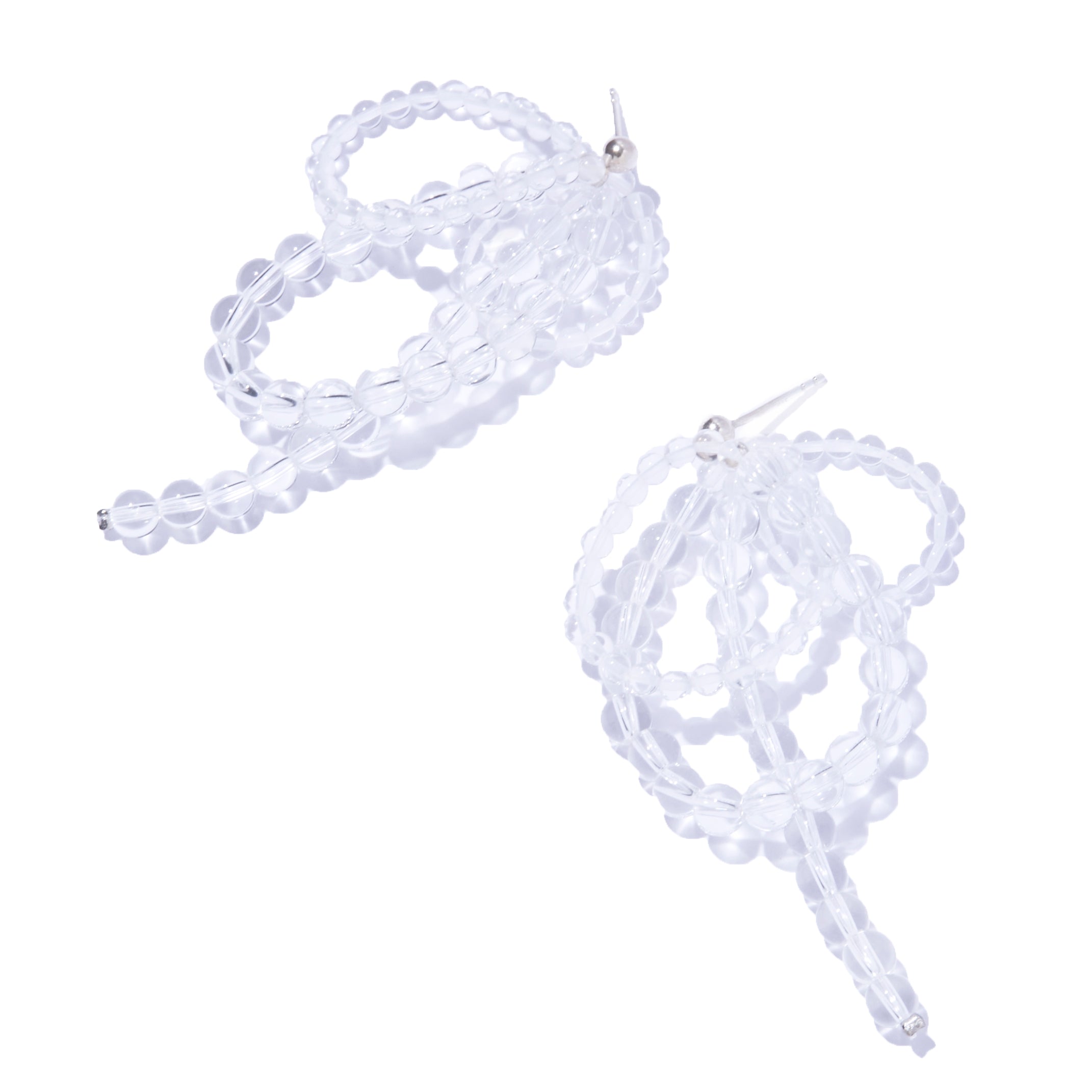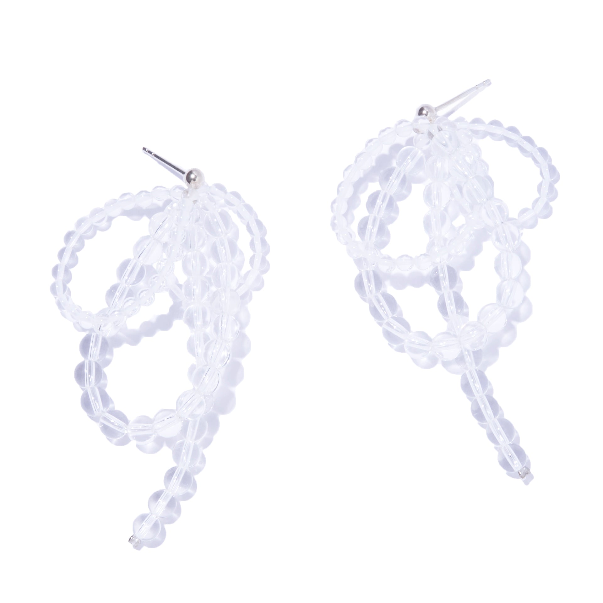 クリスタルで構築されたフープが重なり合い、耳元に奥行きと丸みのある存在感を生み出します。