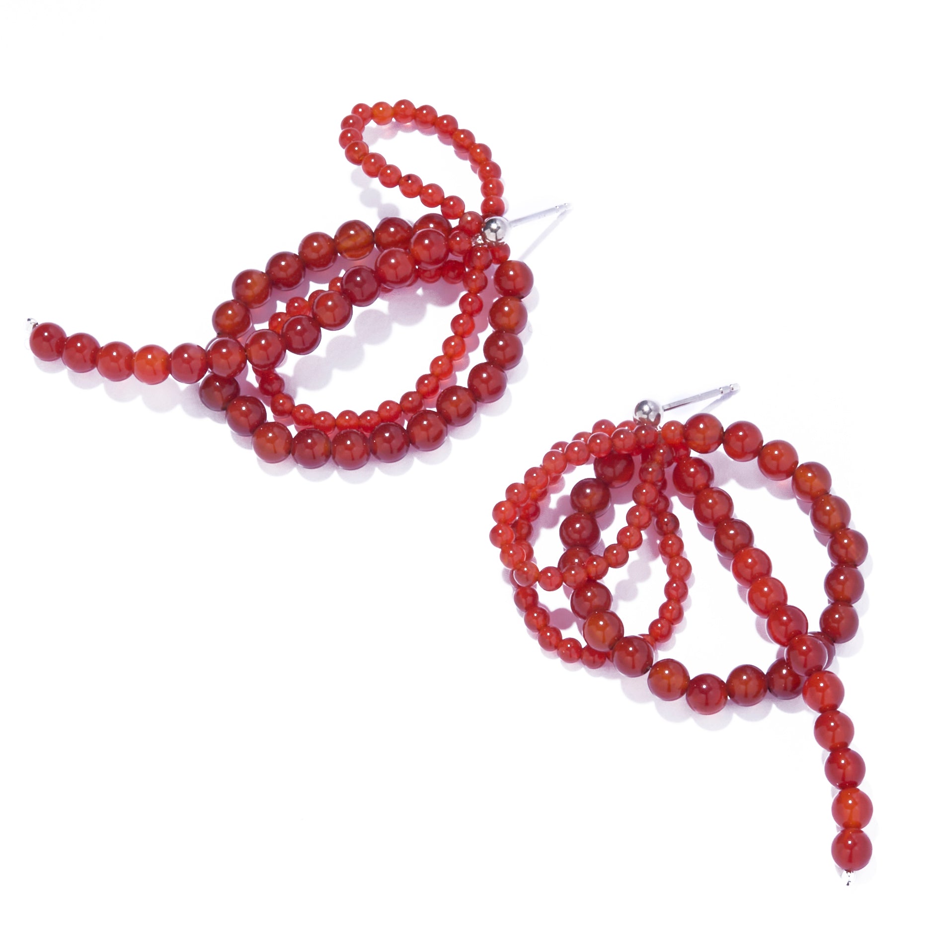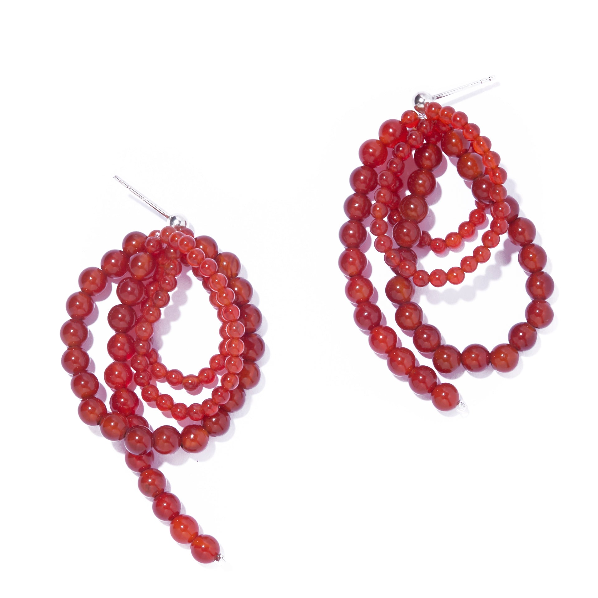レッドアゲートで構築されたフープが重なり合い、耳元に奥行きと丸みのある存在感を生み出します。