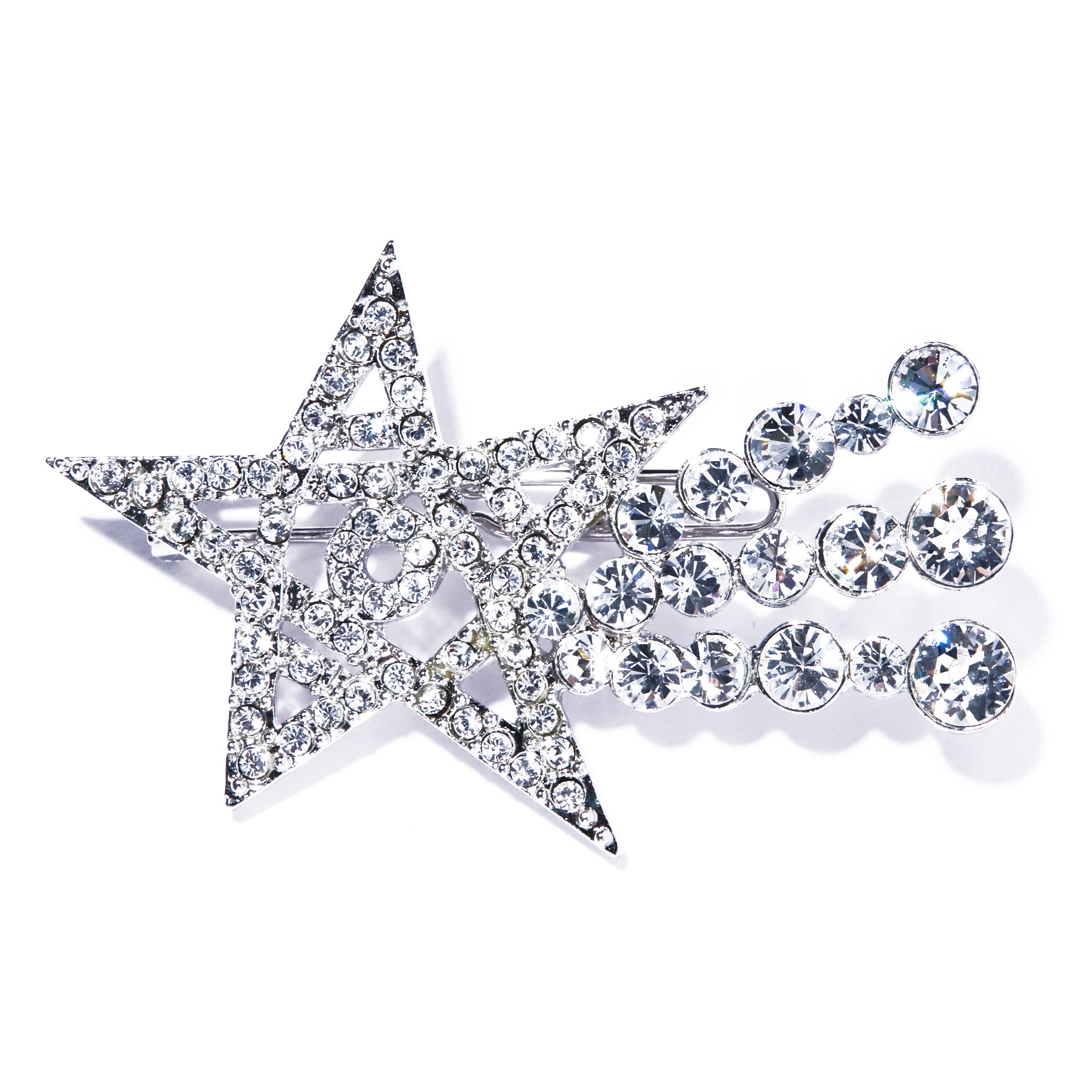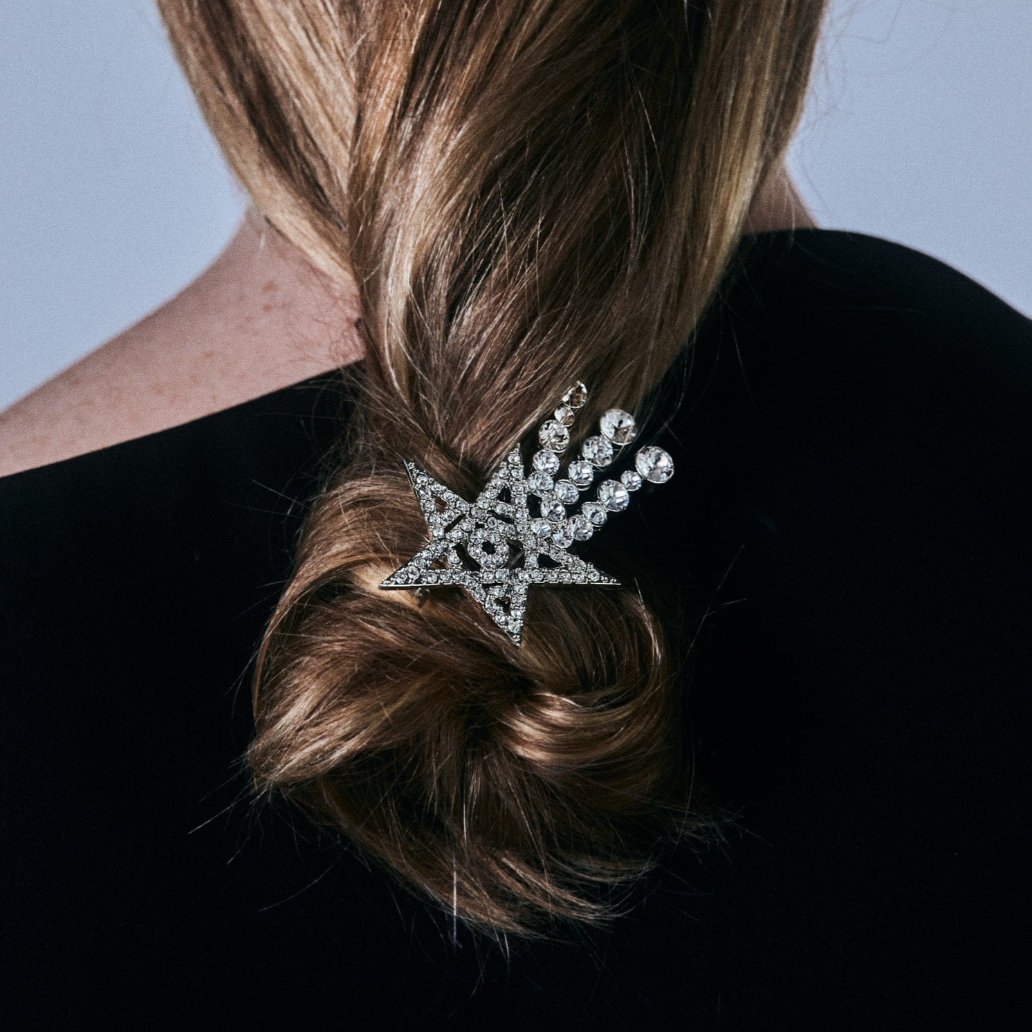 空想の夜空を流れる星のように、ガラスが華やかにきらめき、纏う人の夢を映し出してヘアスタイルに詩的な気配を宿します。