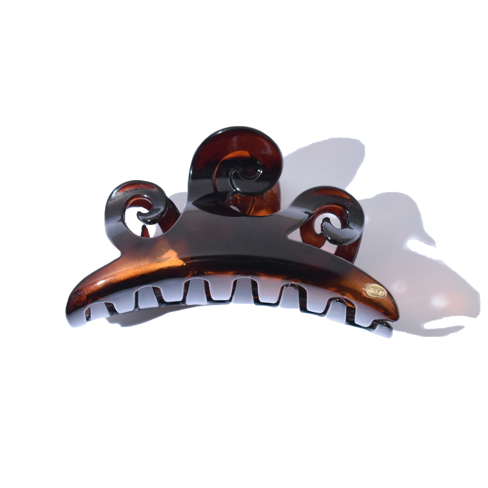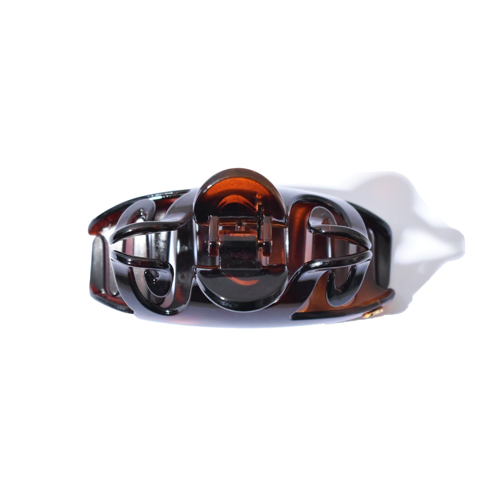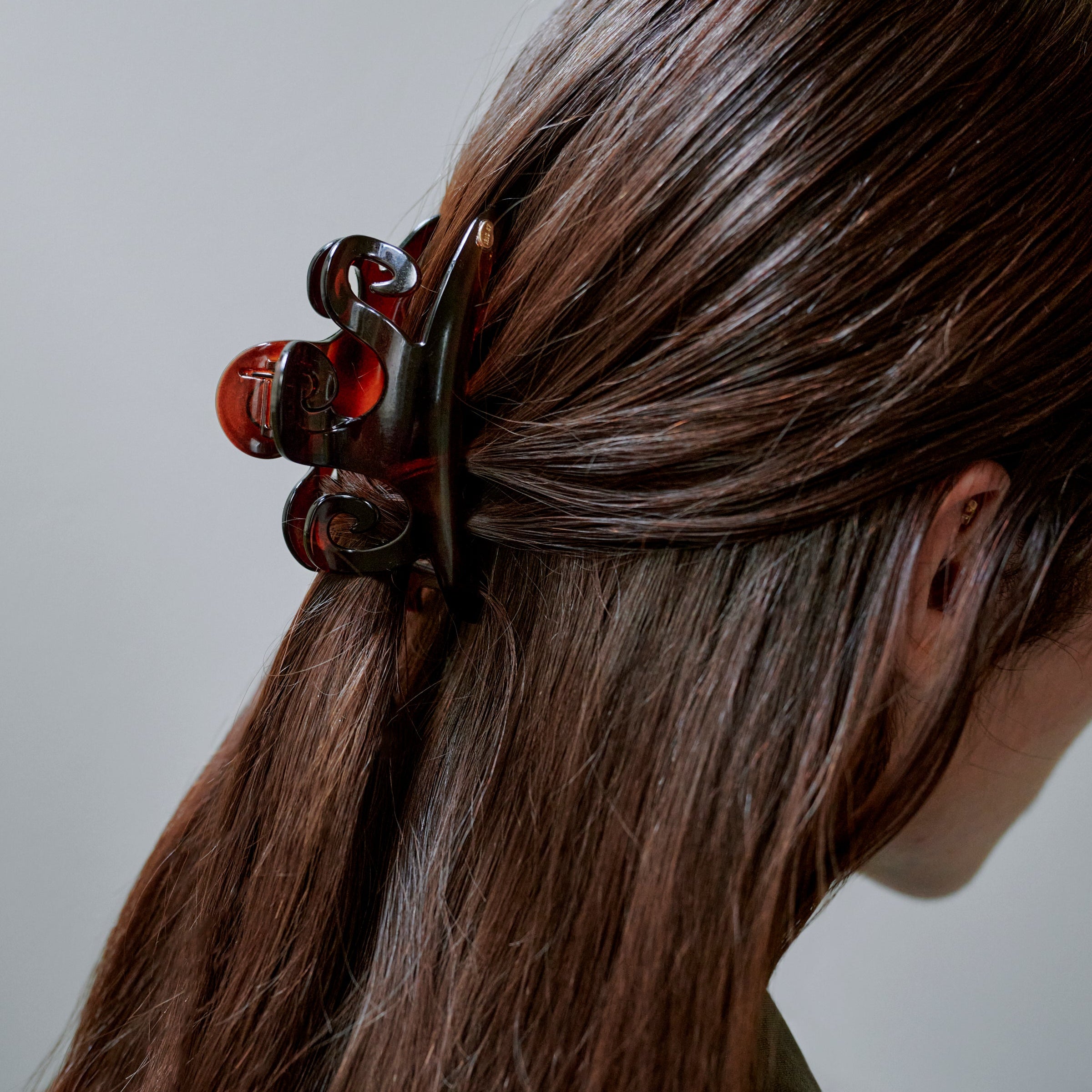 琥珀色のニュアンスが髪色に溶け込み、横顔にさりげない色香を宿すヘアクリップ。